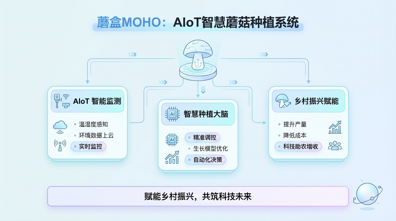 在乡村振兴战略深入推进背景下,蘑盒MOHO团队依托人工智能与物联网深度融合技术,正式实施“智慧蘑菇——基于AIoT的智能种植系统与乡村振兴示范应用”项目。该项目以AI为核心驱动,系统性改造传统食用菌栽培模式,实现生产过程的精准化、智能化与高效化,为乡村特色产业转型升级提供可复制的技术路径。